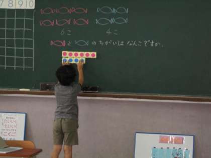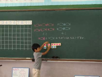 昨日に引き続き,ひきざんの「ちがいをみて」の学習をしました。二つの違いを考えるのですが,今回も難しく時間がかかりました。よくひっかかった問題は,「クレパスが6本,鉛筆が10本,かずのちがいはいくつですか。」です。式を6−10としている人がたくさんいました。先に出てくるかずから引けばいいと思っているようです。大きい方から引くということを何度も繰り返しました。また,明日も続きをします。