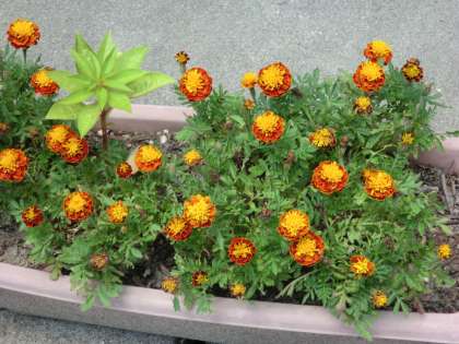 日々成長している植物,ヒマワリはついに大きな蕾をつけました。高いところにある大きな蕾はとても堂々としていて,おひさまのような花を咲かせてくれるのが楽しみです。鉢に植えたマリーゴールドもきれいに咲いています。