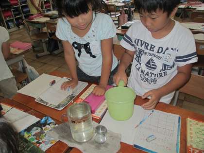 いろいろな入れ物に入る水のかさを予想しました。給食のゼリーの容器,水槽,ペットボトル,洗面器,牛乳パック,なべなどの入れ物を使いました。また調べるためにつかうますも1lますなのか,1dlますなのかを決めました。ペットボトルを調べていたグループは,「1dlますではたくさん入れないとなかなか満タンにならない!」と話し合いをしながら活動していました。洗面器を調べているグループは,1lますと1dlますを上手に使いながら調べていました。グループで協力しながら調べることができました。