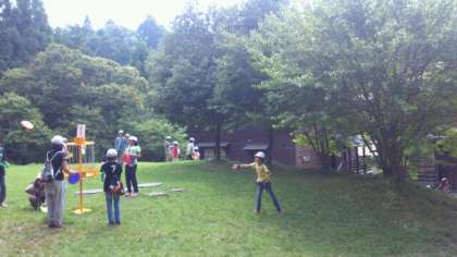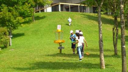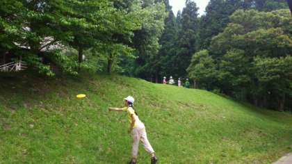 子どもたちは,元気いっぱいフライングディスクゴルフをしています。