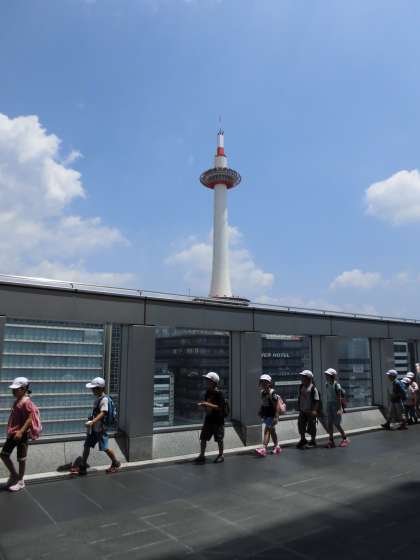 また,大階段を上までのぼり,京都駅の北側や南側の景色を見ました。南側には桃山城も見え,「こんなところまで見えるんだ!」と大喜びの様子でした。