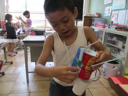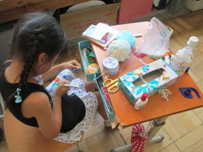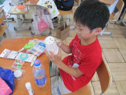 はじめに,「楽しい気持ちになる楽器をつくろう」「周りのかざりを工夫して作ろう」というめあてを確認しました。次に1人ずつがもってきた材料を紹介し合いました。そして ,お家からもってきてくれた箱やモール,ストロー,ゼリーのカップなどを貼り合わせて,つくりました。箱に輪ゴムを付けてギターにしたり,ペットボトルにビーズを入れたマラカスとたいこをくっつけた楽器を作ったりしました。最後には作品の工夫したところをカードに書きました。