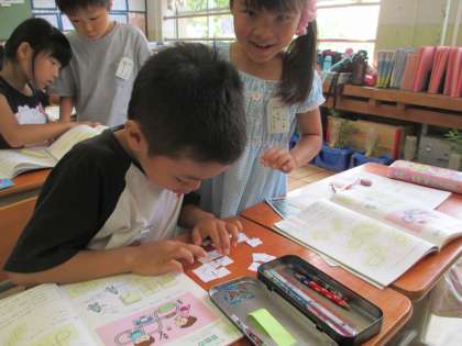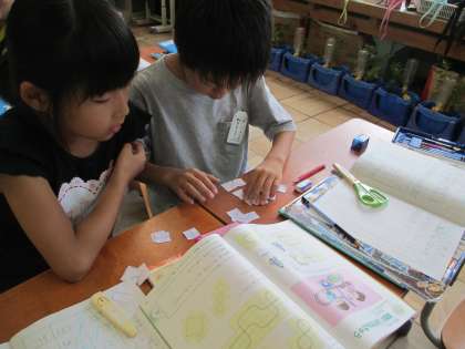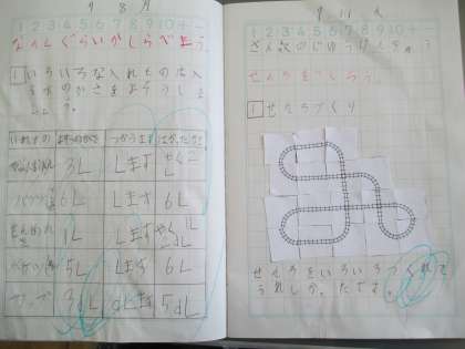 今日の算数では,自由研究の「せんろづくり」をしました。3種類の短い線路をつなげて,いろいろな形の線路を作ります。2人1組でつくりました。教科書に載っている線路が完成すると,「できた!できた!」と大喜びでした。また自分たちで考えた線路を作りました。ねずみのような形の線路や八の字のような線路ができあがりました。ノートには自分のお気に入りの線路をはりました。そして最後にふりかえりの感想を書きました。