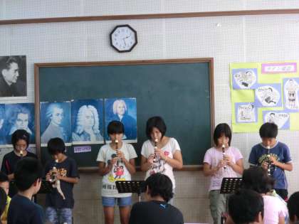 6年生は「カノン」で一人一パートに挑戦しました。カノンは輪唱のように旋律をずらせて演奏する曲です。また,途中で上と下とに分かれるところがあり,全部で6つのパートで合わせます。6人グループを作り,一人が一パートを担当して何度も練習をし,今日発表をしました。伴奏も子どもたちが担当し,素晴らしい出来のグループがいくつもありました。