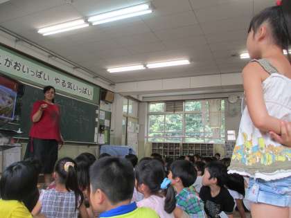 エジプトの食べ物や洋服,学校の様子などを写真やビデオで見せてもらいました。エジプトといえば,ピラミッドを子どもたちは思いうかべていたようですが,授業が終わった後には「絵文字が細かくてすごかったな。」「エジプトの夏休みは6月から9月まであってすごいな。」とエジプトの文化に親しみを持つ感想を聞くことができました。