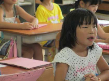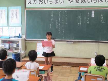 毎朝の読み声タイムです。今日も読み声の時間が始まると,静かに読み声ファイルを取りに行き,始まりました。前に出て読む子どもは緊張をしながらも,こぶしが1つ入りそうな大きな口をあけて読んでいます。読むリズムやはやさも一人ひとり違い,とても楽しいです。4月に比べると,声の大きさがぐんと大きくなりました。素晴らしいですね。