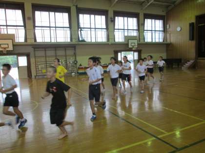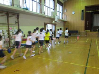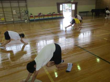 今日は朝ランニングの後,雨が降ってきたので,急遽体育館での練習になりました。筋力トレーニングをした後,体育館のフロアーをジョギングしました。途中でダッシュを組み込みながら,15分ほど続けて走りました。終わった後には,フロアの雑巾がけもしました。楽しく雑巾がけをするのも,足腰のトレーニングになりますね☆