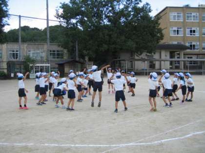 今日の体育は,3時間目は体育館で玉入れのときに踊るダンスをしました。後半部分の踊りの振り付けを初めて踊りました。簡単な振り付けですが,テンポが速く今日は覚えるだけで精いっぱいの子ども達でした。4時間目は,運動場に出て,玉入れの円になりルールを覚えました。はやく本番のように実際に玉入れをしたがっていた子ども達でした。