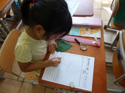 1人1枚はっぱを持ち,虫眼鏡をつかってじっくり見ました。