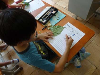 はっぱの真ん中に線が入っていること,真ん中の線からたくさんの細かい線が出ていること,はっぱの裏面はふわふわしていて触り心地がいいことなど,たくさんの発見をしました。