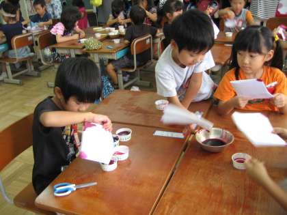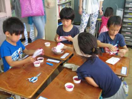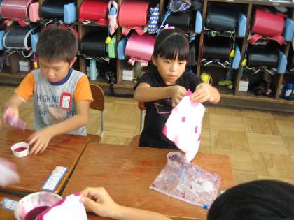 生活科の時間に,毎日水やりをして大切に育ててきた朝顔の花やヨウシュヤマゴボウの実の汁で色染めをしました。子ども達は,花の汁をしぼるのが楽しかったようです。きれいに染まった和紙をみて喜んでいました。この和紙は,朝顔の観察記録をまとめたものの表紙にしたいと思います。学校公開日で,たくさんの保護者の方にみてもらって嬉しそうでした。あさがおの花やそのほかの花を集めてもらってありがとうございます。