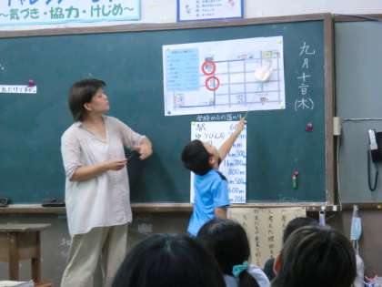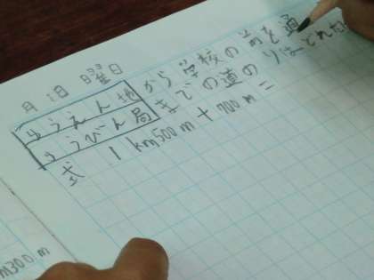 学校や遊園地・駅などの地図に表されたものを見ながら,○○から□□を通って△△までの距離を求めます。○Km△mの表し方に慣れ,分かっている距離を足す式を書く,ということを繰り返し練習します。