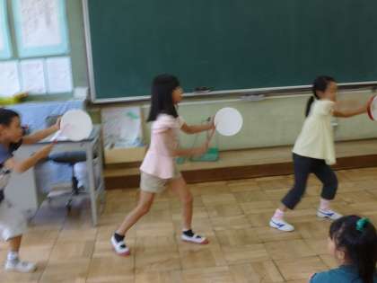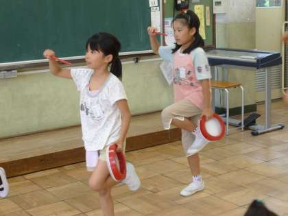運動会の団体演技〜島唄エイサー〜の練習を毎日しています。教室で練習をすることも多いです。今日はグループごとに演技を見せあいました。見ている子どもたちからは「足がまげられてるよ!」「きれいだよ!」「がんばれ!」とたくさんの声援がありました。1つ1つの細かい動きの練習を続けているのですが,だんだんと細かい動きも合ってきました。