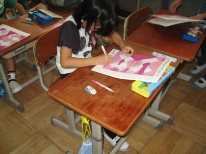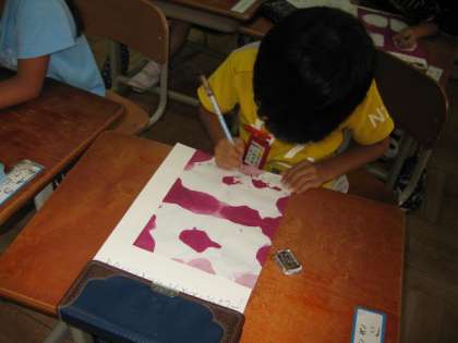 生活科では,今まで書いてきた朝顔の見つけたカードをまとめてアルバム作りをしました。表紙には,この前作った朝顔の花の色染めをした和紙を貼り付けました。すてきなアルバムが出来上がりました。うれしそうな顔をしていた子ども達です。