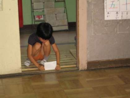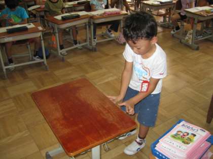 長さくらべの発展として,子ども達が使っている机を横向けに出入り口から出すために,どんな測り方があるか考えました。いろいろな意見がでました。手の指を広げていくつ分か測ったり,はがきの紙を使っていくつ分か測ったりして考えました。これは,ものさしの学習へと発展していきます。このようにして,基礎や基本的な考え方を身につけていきます。