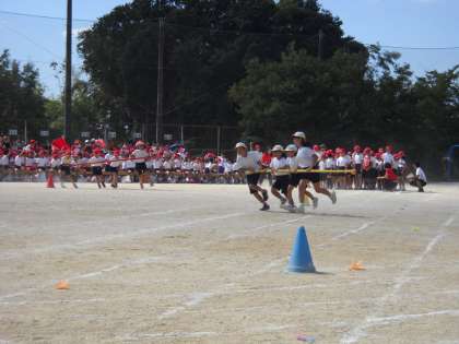 さわやかな秋空の下で運動会が行われました。全校ダンスは「真夏のSounds good」です。応援団による元気いっぱいのエール交換で午前中の種目が始まりました。1年生はかわいいダンスで登場して玉入れです。2年生は「島唄エイサー」心をひとつにかっこよく決めていました。エントリー種目「台風の目」では高学年が低学年をリードするほほえましい姿が見られました。