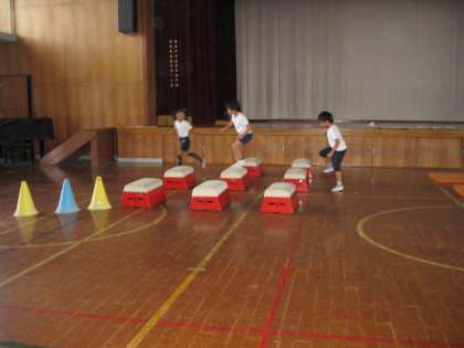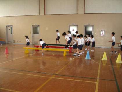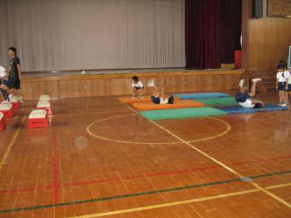 今日は台風の影響で,運動場が使えませんでした。そこで,久しぶりに3クラス合同で体育館で体育をしました。休み時間も外で遊べなかったので,運動量の多いサーキットをしました。フラフープを使っての「けんけんぱ」や跳び箱とびや平均台・両足跳び,そして,今学習を始めているマット遊びなどを取り入れて運動します。子ども達は,汗をかきながら運動していました。もしかすると,筋肉痛になるかしら?