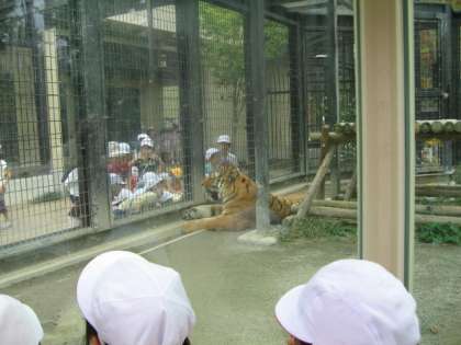今日はだんだんいいお天気になり,遠足日和となりました。1年生は京都市動物園にいきました。10時には到着したので,ゆっくり見学することができました。まずは猿山からです。仲の良い親子の様子を見ながら喜んでいました。その後おとぎのくにに行ったり,猛獣コーナーに行ってライオンやトラを間近で見ました。時間たっぷりかけて見ることができてよかったです。