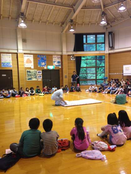 お弁当をいただいた後は,ホールでオリエンテーションです。「みさきの家」の所員の方から布団やシーツのたたみ方について説明していただきました。