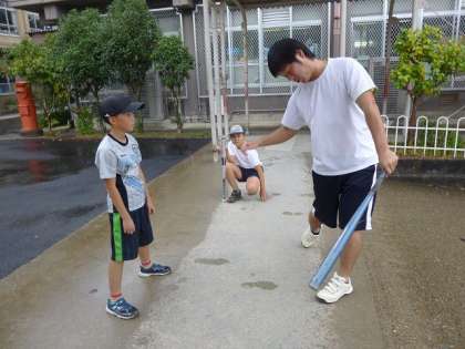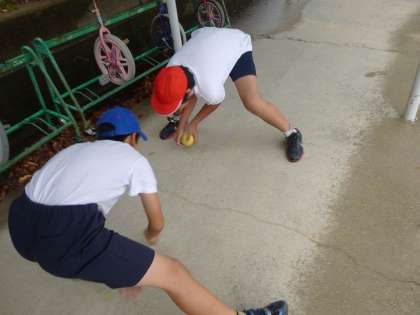 ソフトボール部の練習の様子です。今日は雨が降っているので,軒下で練習をしました。素振りやキャッチボールの練習を中心にしました。素振りは100回やりました。子どもたちは「きついな。」と言いながら,一生懸命練習に励んでいました。