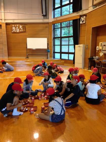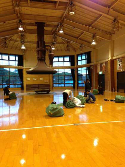 「みさきの家」二日目,子どもたちは元気に起床し,寝床を片付けました。台風は過ぎましたが,まだ風が強いのでホールで朝食です。