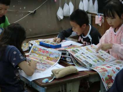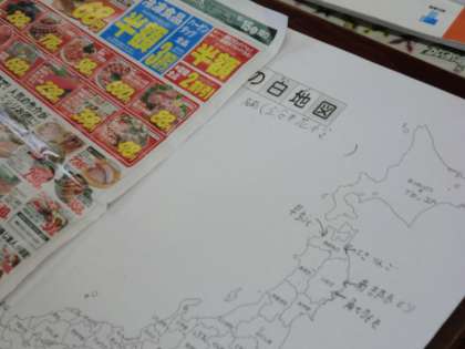 スーパーマーケットの学習で様々なことを学びました。スーパーにはたくさんの品物が並んでいましたが,それらはいったいどこから運ばれてくるのだろう・・・と疑問をもち,調べています。家からチラシを持ち寄り,グループでチラシの隅々まで見ながら地図に書き込んでいきます。京都でとれたものや作っているものだけでなく,日本全国や海外からも品物が運ばれてくることがわかりました。