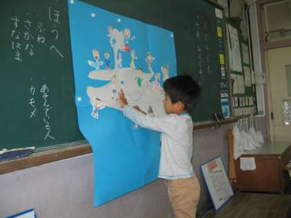 教室に大きなくじらぐもが現れました。教科書と同じように,くじらぐもに乗って,色々なところへ旅をします。いきいきと子ども達は自分を描いて,貼り付けていました。