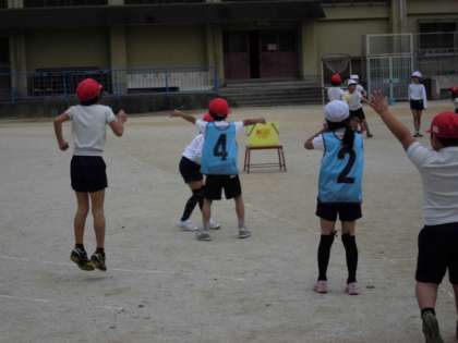 運動場体育の「パスゲーム」です。たくさん回数を重ねてきて,パスのコツがわかってきました。パスをつなげて点がとれるようになってきて子どもたちも大喜びです。友達と喜び合う姿がたくさん見られるようになってきて,うれしいです。