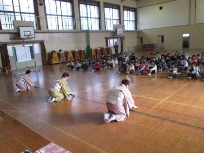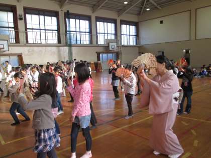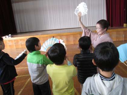 総合的な学習の時間に,日本舞踊教室を行いました。地域にお住いの坂東先生をお招きし,日本舞踊の中の「鶴亀」と「祇園小唄」の動きを紹介していただきました。扇子を使ったり,足の角度・姿勢などに気をつけることで表現していきます。