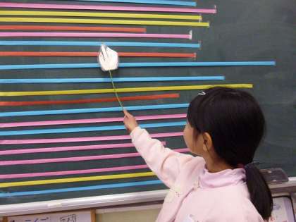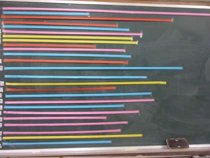 その後に,1mに一番近い長さをはかれる「1mものさし名人」を決めました。子どもたちは「これぐらいかな?」と言いながら,紙テープを切りました。全員の長さを比べてみると,「長かったかな」「短かったかな」という声が聞こえてきました。1mものさしと比べると,1mにほぼぴったりの子どもがいました。子どもたちから「すごい!」と声が出ました。長さの感覚を少し感じ取ってもらえたら嬉しいなと思います。