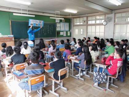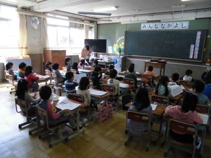 本校で教師生活をスタートした担任のクラスに入ると子ども達から質問を受けていました。どんな先生なのか,子ども達の関心は高かったです。(写真…左)