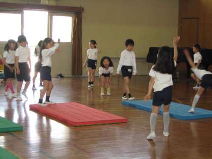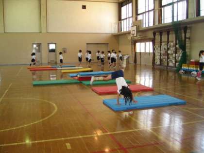 連休明けに体育の授業がありました。準備運動として運動場を大回りで二周走りました。休みの間,身体を動かしていない人もいるようで,「ああ,疲れたよう。」なんて座り込む人がいました。その後十分間ほど総合遊具で遊びました。気温がどんどん上がってくるせいか,遊ぶのをやめて日陰に行く人もいました。それから,体育館に場所を変え,マット遊びの仕上げをしました。今日は側転を一人ひとり見せてもらいました。腕やひざが伸びてきて上手に回れる人が増えてきました。これで,マット遊びの授業が終わるのは,残念です。せっかく上手になってきたので・・・。