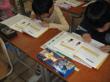 算数の学習では,「ミリメートル」を教えました。長さを測るのに,端から少しでもずれると,答えが違ってきます。「ああ!難しいなあ。」「すぐずれるよ!」「この細かい目盛り読みにくいよ。」などと子ども達は四苦八苦しながら計っていました。