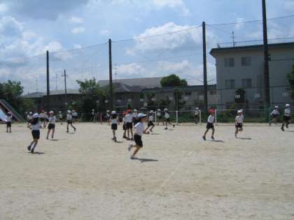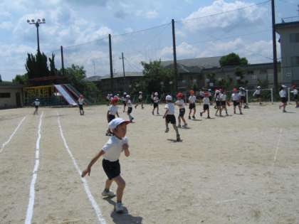 今日の体育は,1組と2組が合同で50メートル走のタイムを計りました。一生懸命走っていた子ども達です。その後,色々な鬼ごっこをしました。気温がどんどん上がってくるので,汗をいっぱいかいて走っていた子ども達です。今日は本当に暑かったです。