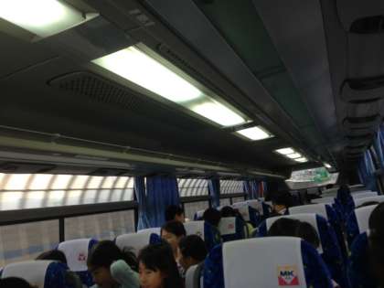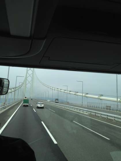 バスは現在,明石海峡大橋を通過中です!バスの中では,周りの友達と楽しく会話を楽しんだり,バスガイドさんの説明を聞いたりしています。