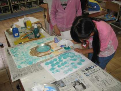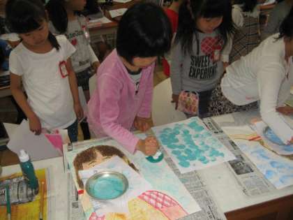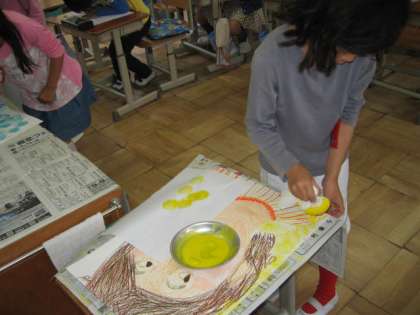 今日は,雨が降って運動場の土の具合が悪かったので,体育の代わりに図工をしました。「歯磨きの絵」のバック処理をして仕上げました。お米をガーゼにくるんで,「タンポ」を作り,絵の具をつけてスタンピングしました。みんな真剣な表情で作業していましたよ。学校公開日や日曜参観のときにご覧ください。