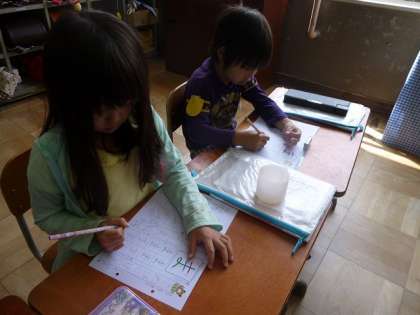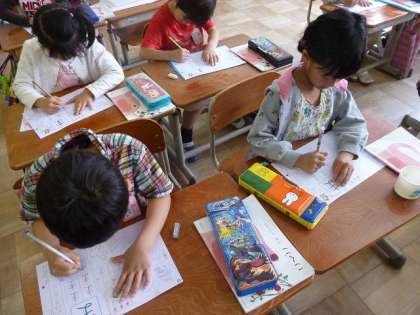 国語ではひらがなの練習をしています。はじめにどんな字を書くのか学習して,そのひらがなのつく言葉をみんなで集めています。だんだんと言葉の数が増えてきて,みんなでたくさんの言葉を集めています。楽しくみんなでひらがなの練習をしていきたいです。