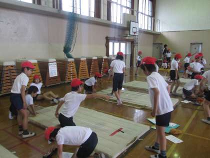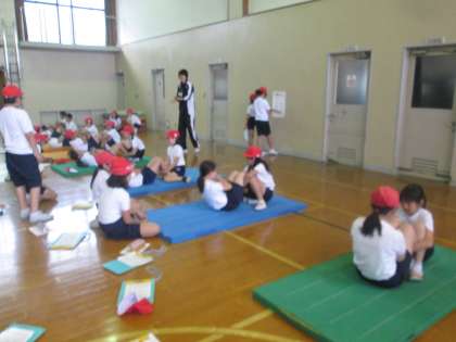 5年生では,体力テストに取り組みました。ソフトボール投げや反復横跳びなど,自分の記録に挑戦しました。「自分の力を精一杯出しきろう」をめあてとして,一生懸命に取り組んでいました。