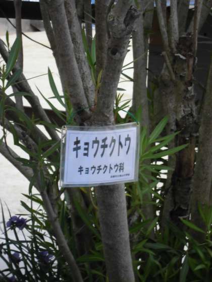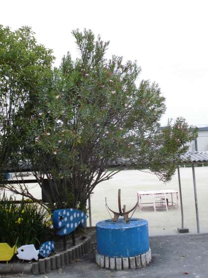 中庭にある「知恵の泉」と「日時計」の南側にキョウチクトウ(夾竹桃)の木があります。
