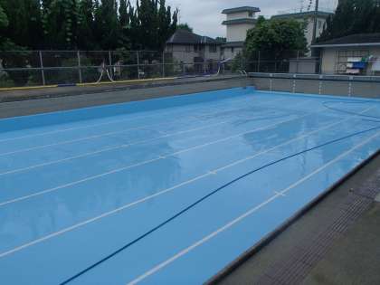 徹底した安全管理の為,昨年度から全市的に「すべての児童の両肩が水面に出る水位」にすることになっています。今年度ペンキ塗り工事をしていただいたので,水位は低いままですが少しでも擦り傷が減ることを期待しています。