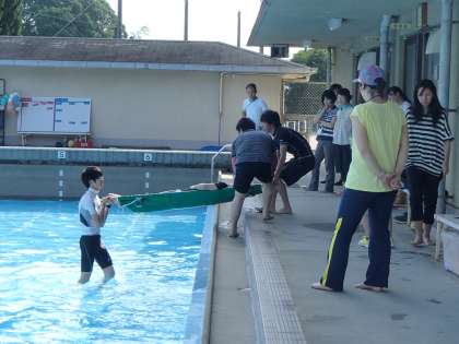 先月の救急救命講習を受け,本校の水泳学習時に事故が発生した場合を想定した研修を行いました。