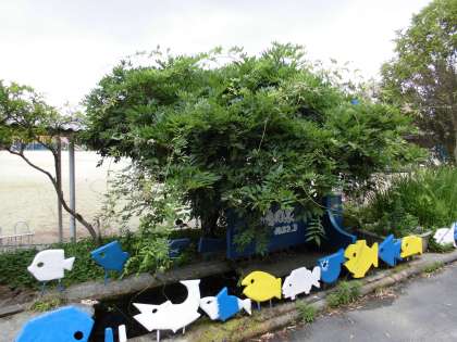 中庭の「知恵の泉」の南側にフジの木があります。