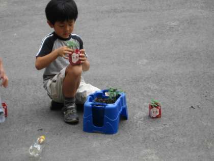 生活科の時間に,ミニトマトの苗を植木鉢に一本にしました。ついこの前,間引きをしたところですが,もう大きく成長しています。一本にしたので,ぐんぐん伸びていくことでしょう。間引きをした後,「わあ,土がからからになっている。水をあげなくちゃ!」といそいで水やりしていた子ども達です。