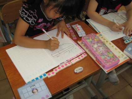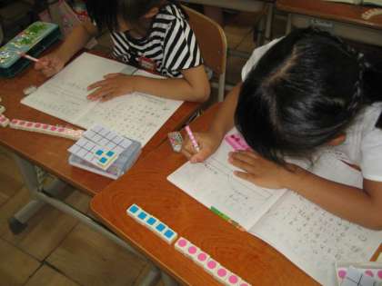 算数では,問題をわかりやすくするために,テープ図で表す学習をしました。これまでに子ども達は,文章問題では問題場面を読み取るために数図ブロックを操作する活動をしてきました。この学習は具体物を操作しなくてもテープ図に表すことで問題場面を簡単に理解できることを知らせます。今日はその便利なテープ図のかき方を学習しました。