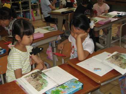 国語の学習では,「スイミー」が佳境に入ってきました。今日は,スイミーが岩陰にそっくりの小さな魚達を見つける場面です。スイミーと赤い魚のペープサートを使って,二人組で役を決めてかけあいをしました。文章に書かれていない気持ちを考えて付け足して話します。子ども達は,やっと作ったペープサートが使えたので大喜び!それぞれの気持ちも入り,嬉しそうに動かしながら,セリフのやりとりをしていました。