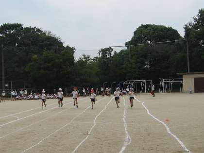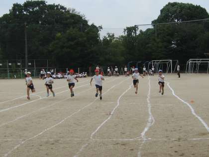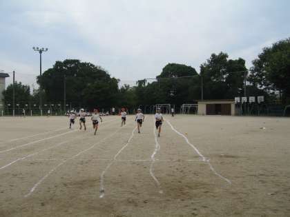 青空の下,体育ではまず50メートル走の練習から始めました。よそ見をせず,最後まで走り抜きます。だんだん速くなってきています。当日が楽しみです。