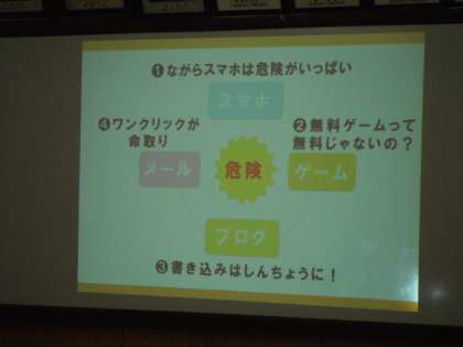 の4つの項目でお話をききました。実際におきている事例を紹介していただき、トラブルにまきこまれない、犯罪にかかわらない強い意志や注意力が必要だということを学習しました。