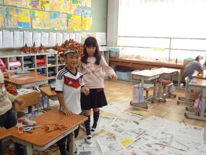 今日の図工の時間は,桃山発表会の時に使う大道具や小道具を作りました。鬼の頭は,なかなか作るのが大変で,友達に手伝ってもらってやっと完成しました。舟や鬼が島は大きなものなので,みんなで協力しながら色を塗りました。なかには,裸足になって模造紙の上に乗り,一生懸命塗ってくれた人もいます。みんなで作ったものは,出来上がるとうれしいものです。2年生になると,こんなお手伝いもできるようになるのですね!