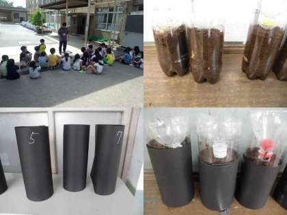 ・ペットボトルをすっぽり全部黒い紙で周りを覆っているクラスと土の部分だけを黒い紙で覆っているクラスと何もしていないクラス