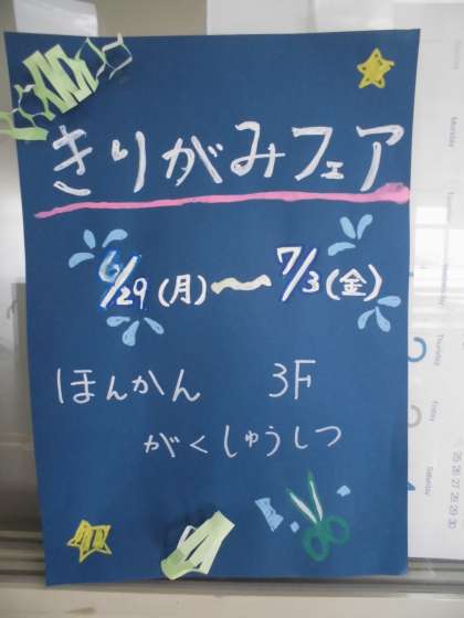 本館3階の学習室で,「きりがみフェア」が休み時間に行われています。たくさんの種類の型紙の中から,どれを作ろうかと選ぶ子どもの姿がありました。